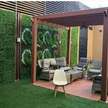 تصاميم 2026 للجلسات تركز على المواد المعالجة التي تحاكي الطبيعة لكنها تقاوم العوامل الجوية بأعلى كفاءة، مع وسائد مريحة تدوم طويلاً.1. الخشب الصناعي المعالج🪵