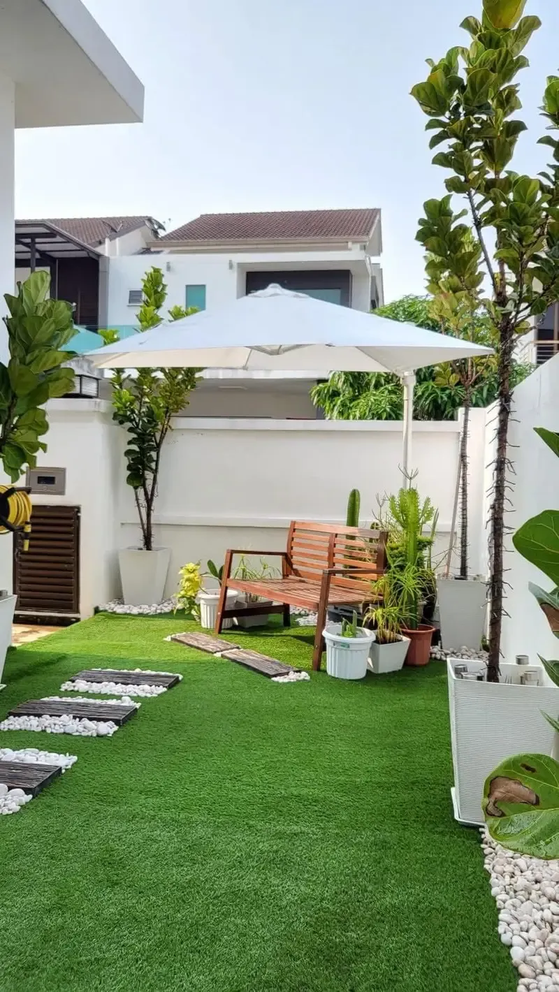 - الأثاث والديكور: اختيار أثاث مقاوم للطقس (كالخيزران الصناعي أو الخشب المعالج أو الأثاث المعدني) مع وسائد مريحة. يمكن إضافة مدفأة خارجية أو نافورة مياه صغيرة لتعزيز الأجواء.